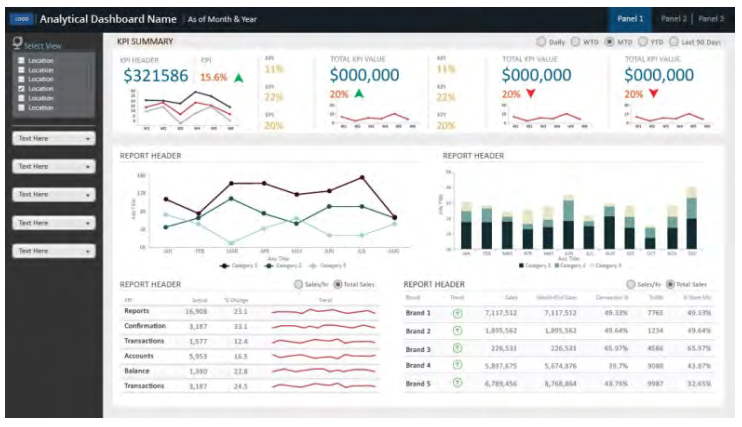• Summary Section: Nơi nổi bật nhất, chứa các nội dung trả lời ngay mục đích của Dashboard (VD: Key KPIs)