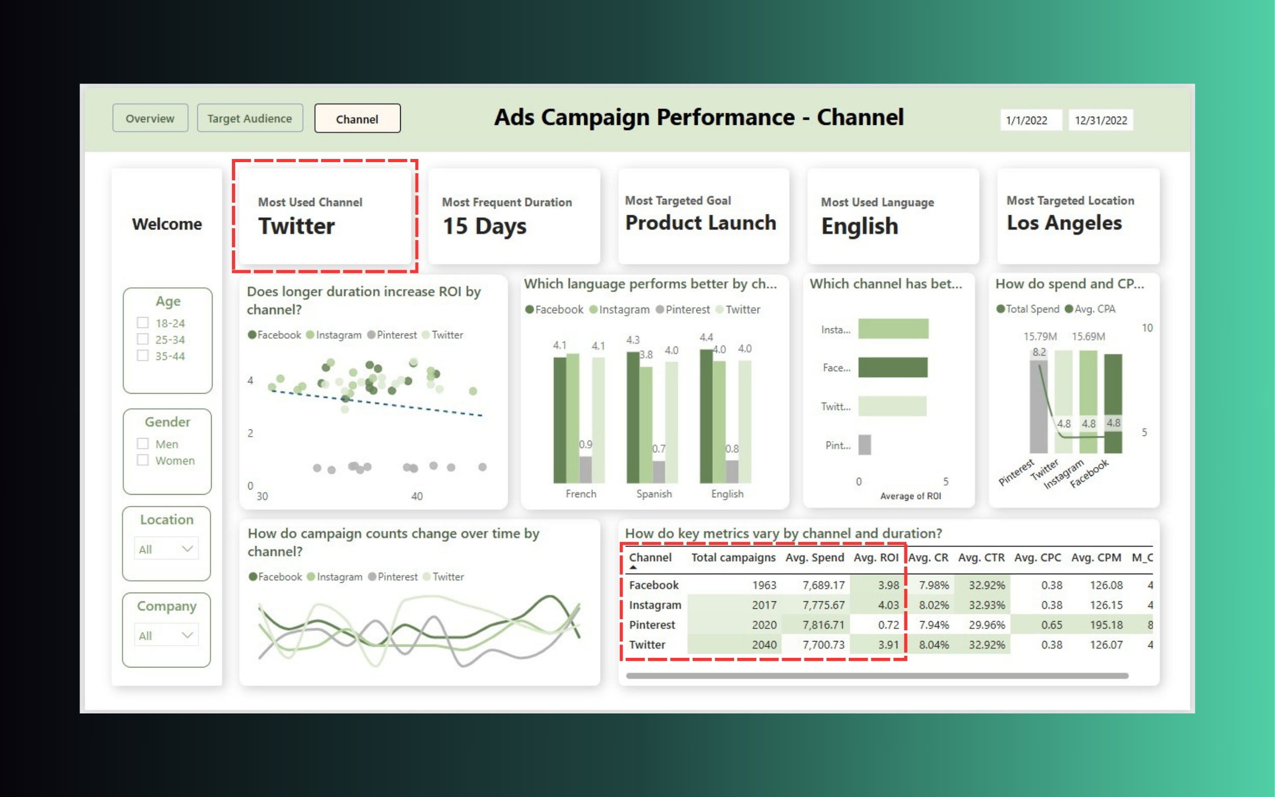 Channel: Twitter được sử dụng nhiều nhất, nhưng ROI lại thấp hơn Facebook và Instagram → cần đánh giá lại kênh phân phối nội dung.