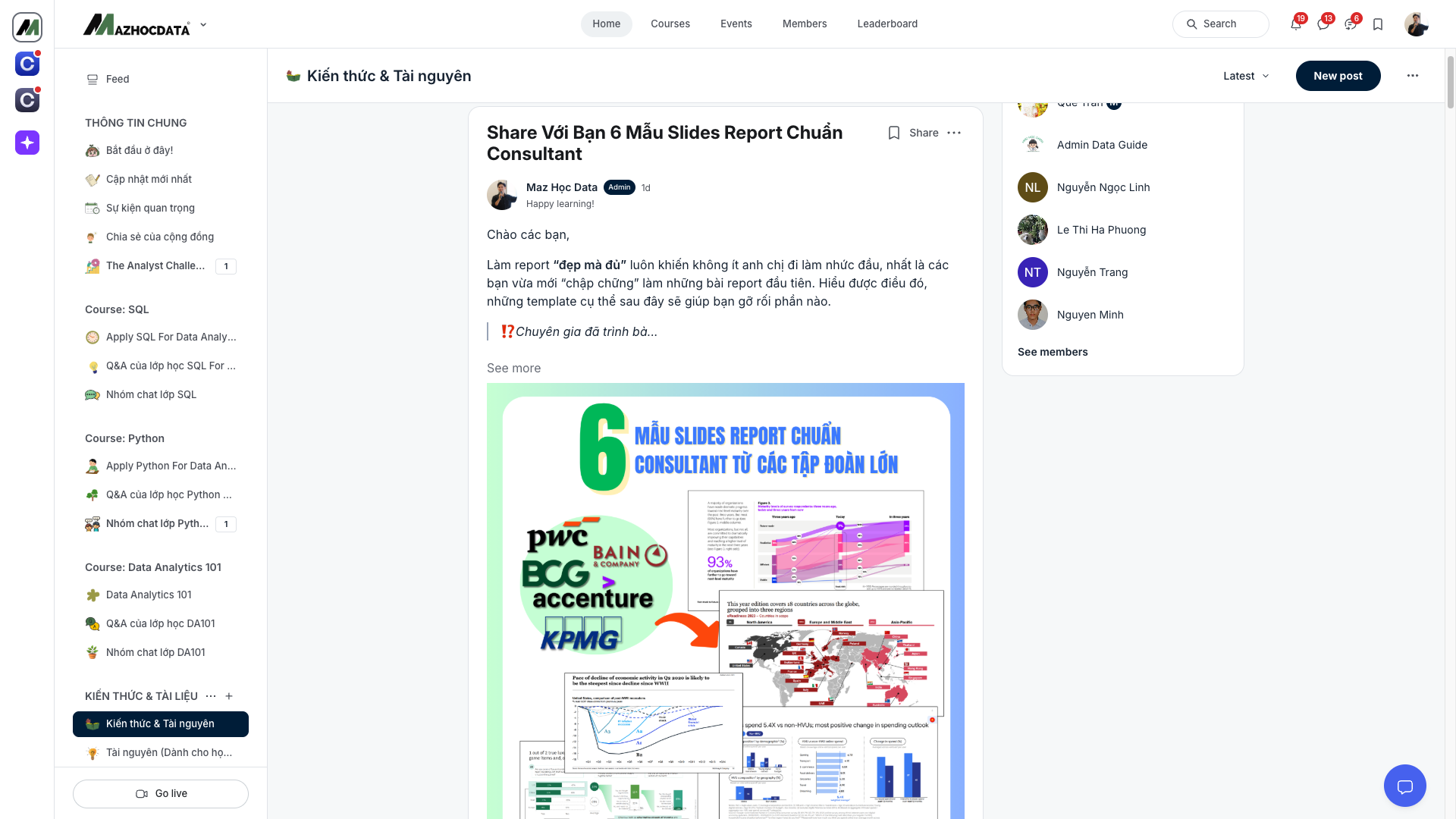 Bạn sẽ không học một mình mà luôn nhận được sự hỗ trợ từ team Mazhocdata khi được tham gia nhóm Q&A giải đáp thắc mắc của từng khóa học. Bạn được quyền đặt các câu hỏi về các vấn đề: bài giảng, công cụ, khó khăn bất cứ lúc nào.